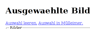Auswahl in MülleimerBisher war es problematisch, viele Bilder, etwa von einem missglückten Upload, aus der Datenbank zu entfernen. Als Admin ist da der Griff zu SQL nicht fern, das will ich aber nicht zur Gewohnheit werden lassen. Deshalb dieser neue Aktionslink für die Auswahl!